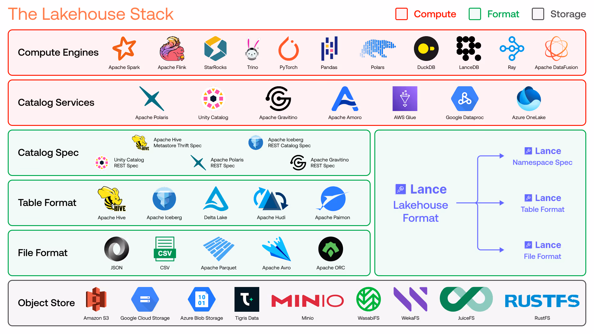 Lance spans three layers of the stack, because it's simultaneously a file format, table format and a catalog spec.