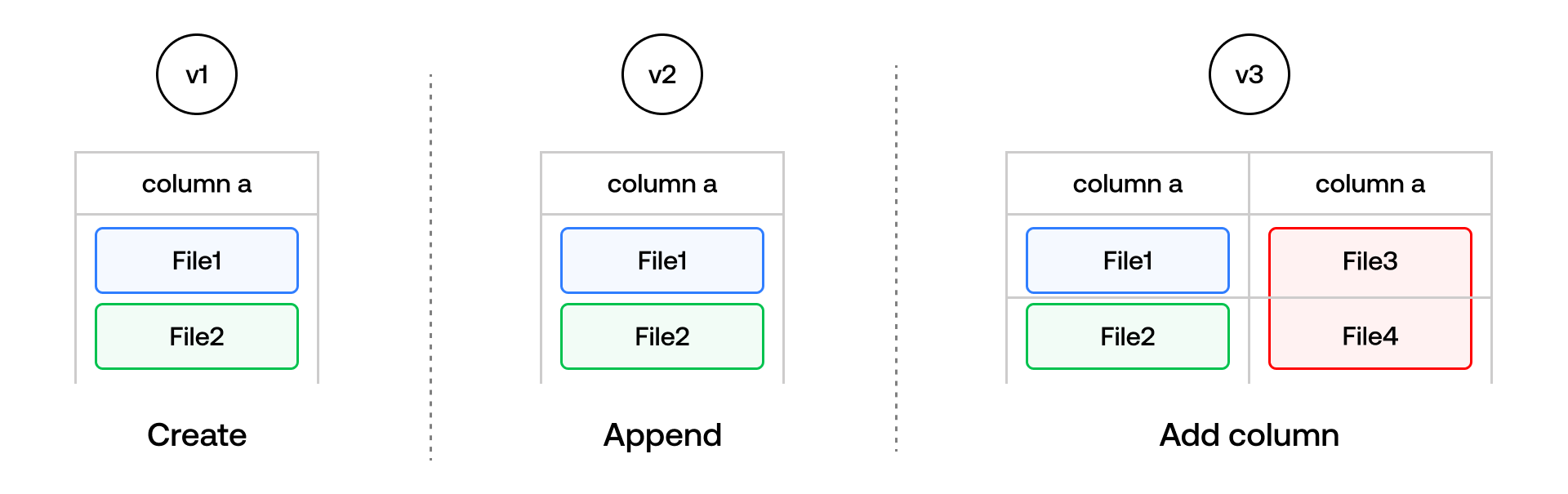 A common need as the dataset scales in size is data evolution, i.e., changes to the table schema and adding, updating or removing columns and their associated data. These types of operations are especially common in ML/AI applications, where multiple developers working in parallel frequently add features, predictions or embeddings as new columns to an existing table. In Iceberg, data evolution comes with a non-trivial cost — adding data to a new column requires a full table rewrite since Parquet stores entire row groups together. This means that for very large tables, it’s common to see multiple new feature columns being added in parallel by multiple teams in an organization – which would require a table lock as new columns are being added, bottlenecking the feature engineering process.