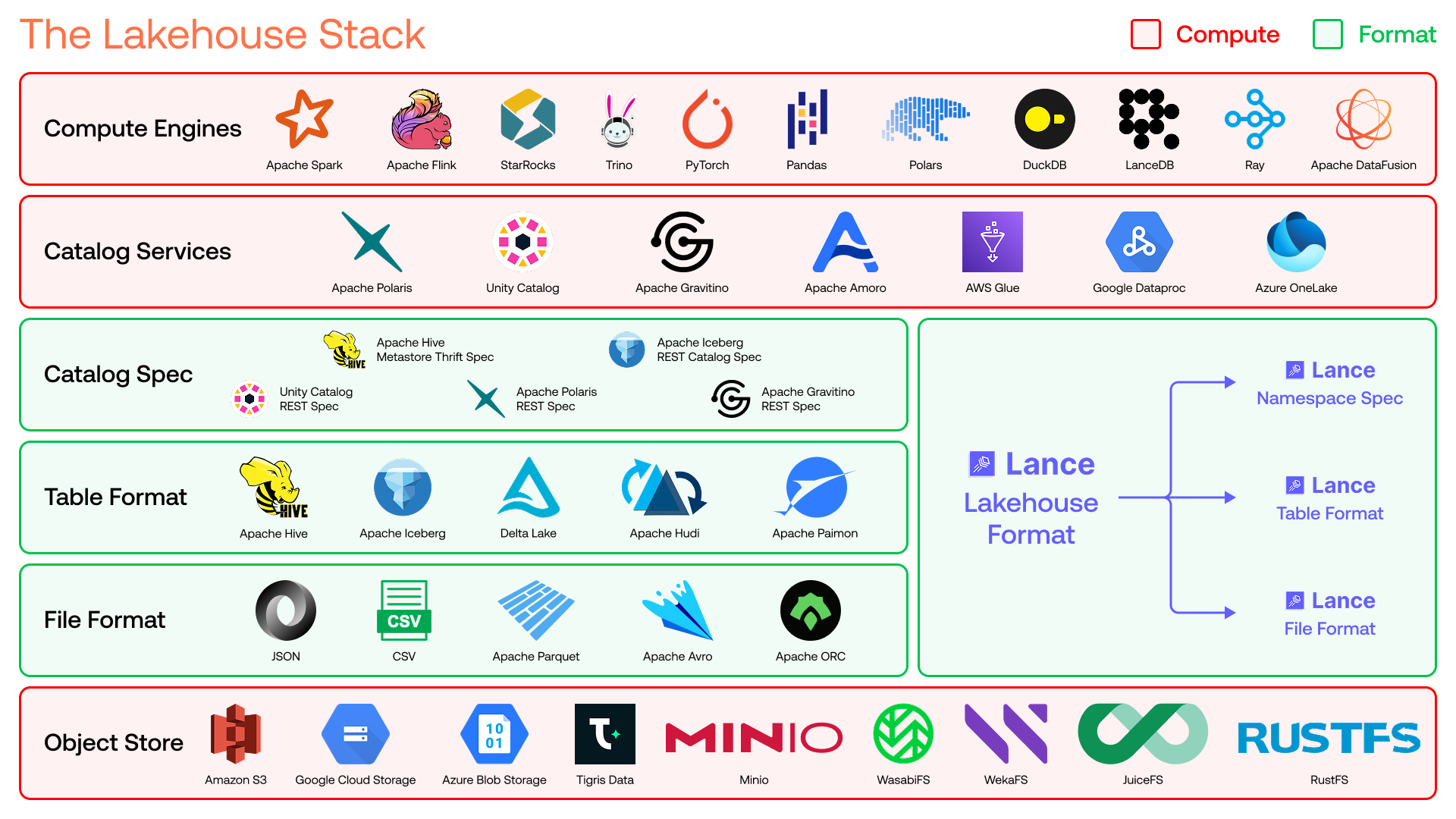 Lance spans three layers of the stack, because it’s simultaneously a file format, table format and a catalog spec.