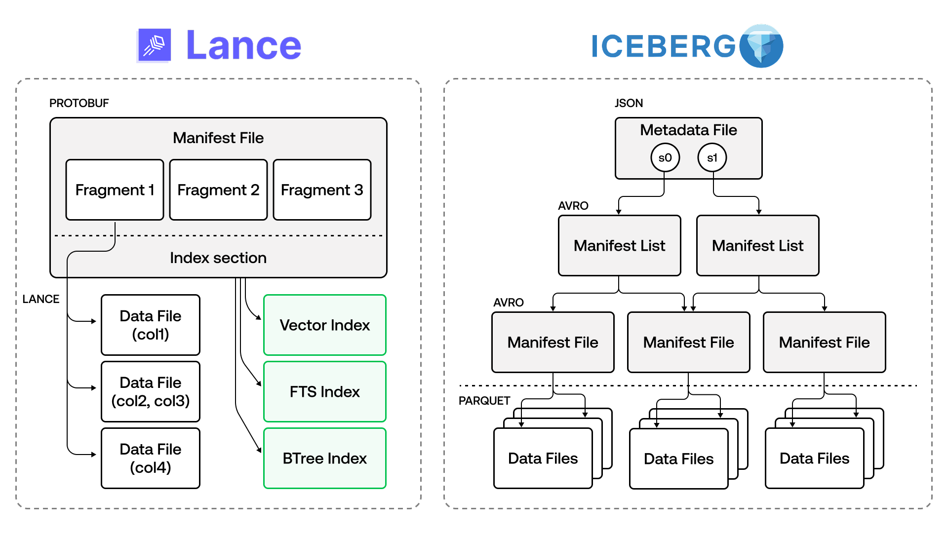 In the sections below, we’ll compare and contrast Lance and Iceberg at each of these layers.