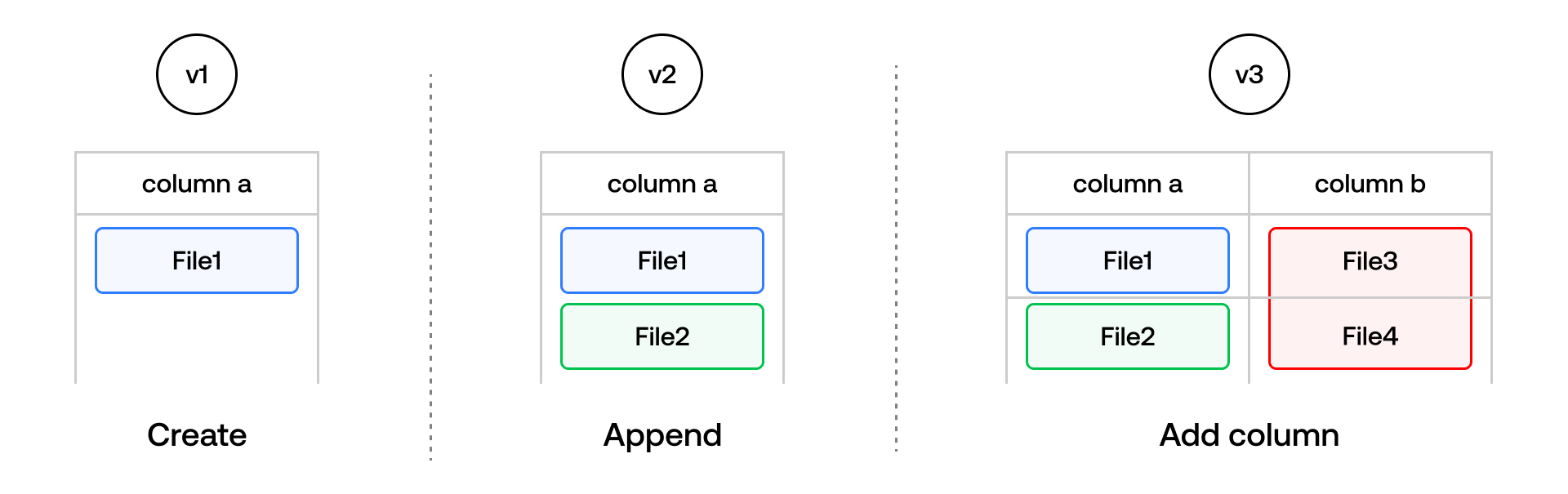 A common need as the dataset scales in size is data evolution, i.e., changes to the table schema and adding, updating or removing columns and their associated data. These types of operations are especially common in ML/AI applications, where multiple developers working in parallel frequently add features, predictions or embeddings as new columns to an existing table. In Iceberg, data evolution comes with a non-trivial cost — adding data to a new column requires a full table rewrite since Parquet stores entire row groups together. This means that for very large tables, it's common to see multiple new feature columns being added in parallel by multiple teams in an organization – which would require a table lock as new columns are being added, bottlenecking the feature engineering process.