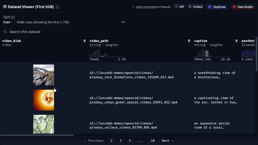 Currently, this still requires a subset of video frames to be copied on the server-side, which adds a small amount of loading time. In the future, we’re hoping to enable sub-second page-loading in the viewer by pointing the HTML directly to the video blobs inside Lance files on the Hugging Face storage system.
