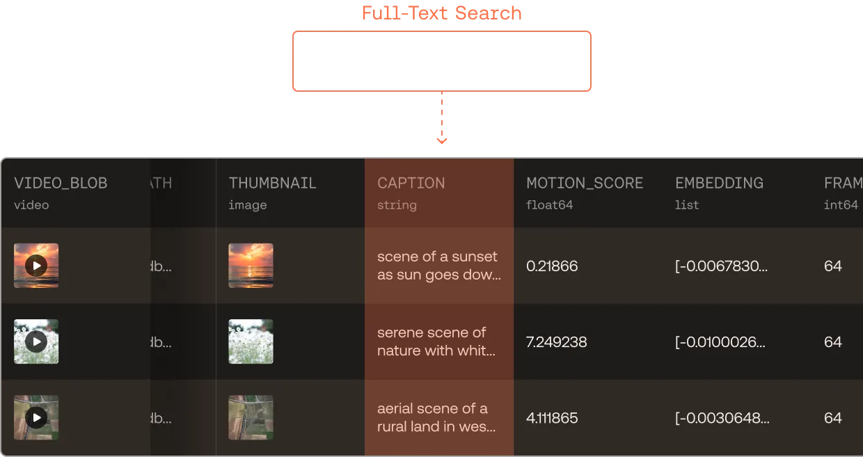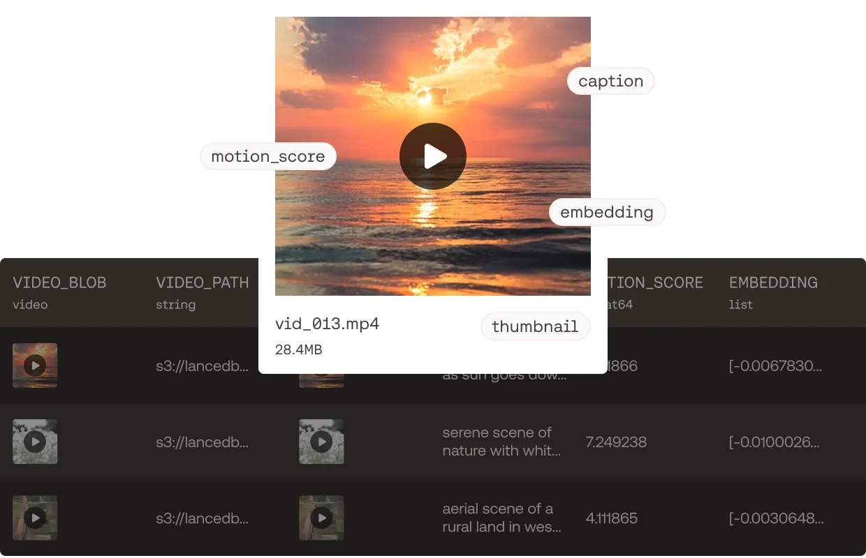 Search over raw bytes, enriched features, metadata, and embeddings live together. Horizontally scalable to 100K QPS for massively parallel agents. Built on the new open source standard for multimodal data.