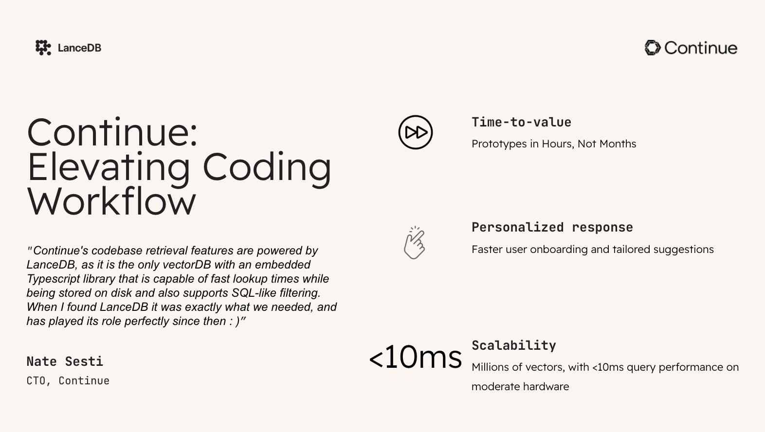 As enterprises adopt Continue to democratize AI-powered coding across global engineering teams, LanceDB’s scalable cloud infrastructure and enterprise-grade security will anchor mission-critical deployments - enforcing compliance, accelerating cross-team collaboration, and future-proofing innovation as organizations grow.