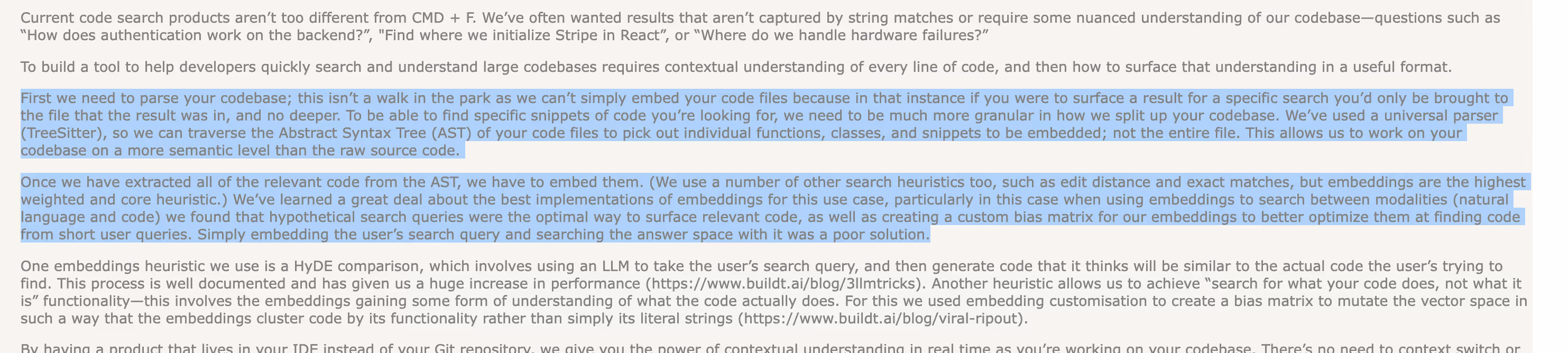 In this post, we discussed how to go from a naive semantic code search solution to a more elaborate, syntax-level chunking strategy with tree-sitter. We’re almost done with preprocessing! In Part 2, we’ll see how to embed, some tricks to improve embedding search and then some post-processing techniques.