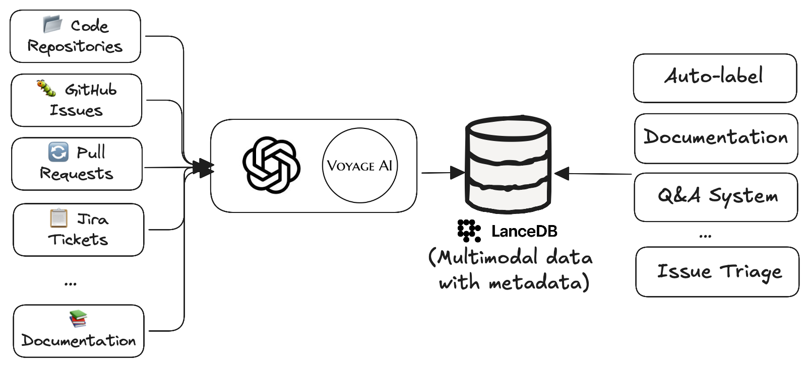 Dosu ingests and synthesizes multimodal development data, including source code, GitHub activity, and documentation, to build a living knowledge graph that reflects the state and evolution of a software project. It transforms code structures like functions and classes into semantic embeddings while also embedding context from related issues, pull requests, and discussion threads. This enriched data, tagged with structured metadata such as repository identifiers, timestamps, and file paths, is stored and indexed in LanceDB for high-performance retrieval.