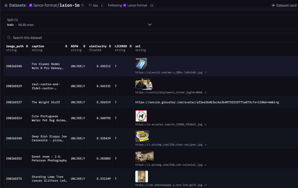 Lance tables look and feel very much like other table formats you may be familiar with. When you upload a Lance dataset, you get a preview of not only the scalar columns, but also images.