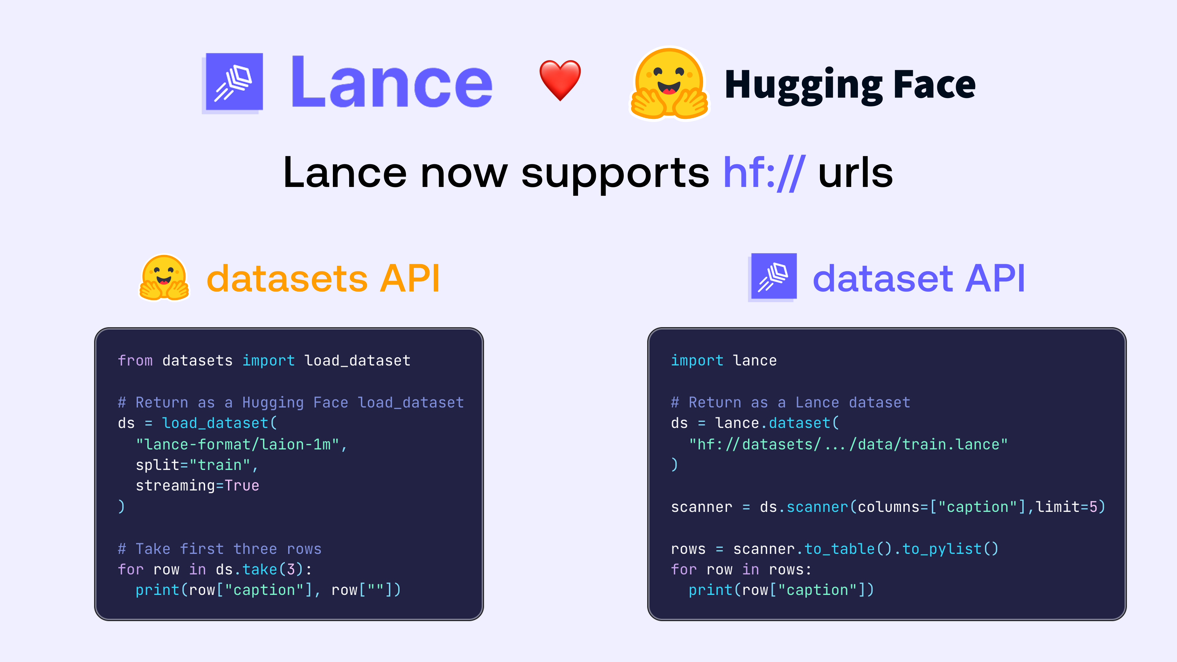 Your datasets in Lance format are natively supported on the Hub, meaning that you can access them via the familiar datasets API from Hugging Face, or Lance’s dataset API.