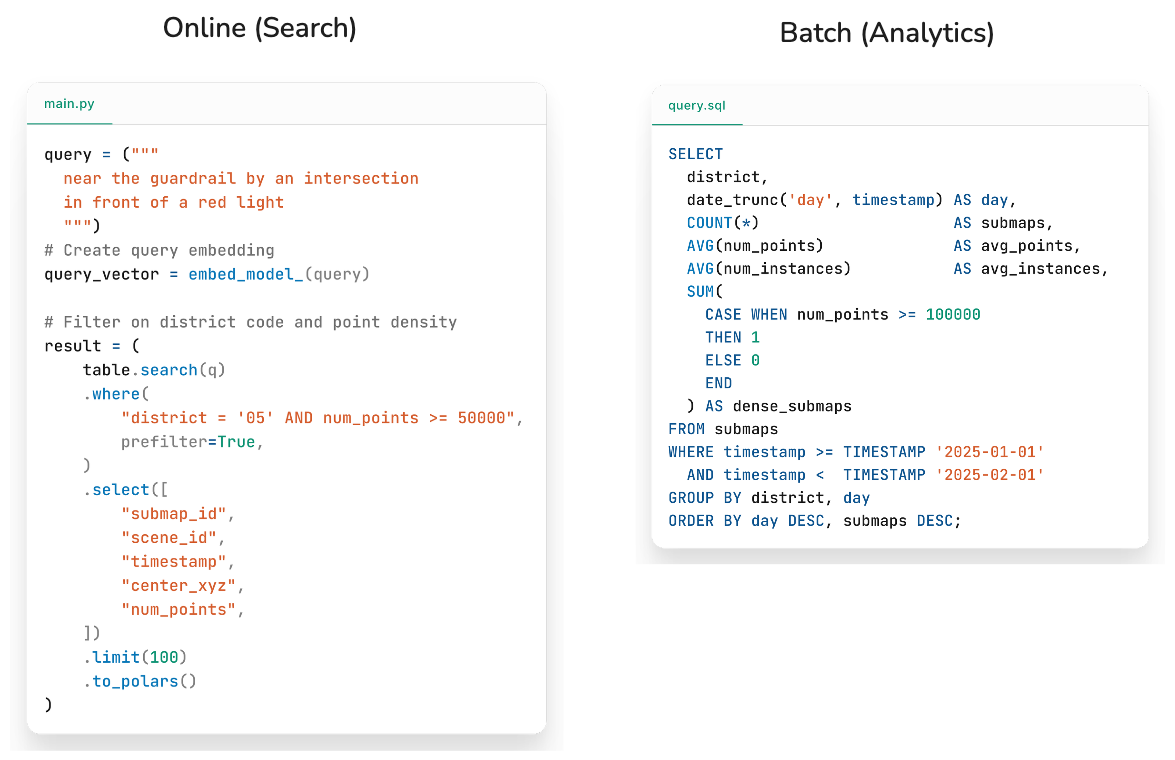 Below is an example of two different access patterns in an autonomous vehicle dataset. The first one shows an online scenario you may want to search, explore and isolate (in real time) a small subset of scenes that align with a query in vector space. The second one shows how that same data, at a different point in time, may be used to run a batch SQL query (which LanceDB supports via the Arrow FlightSQL protocol , or via DuckDB using the lance-duckdb extension) for a month-end report.